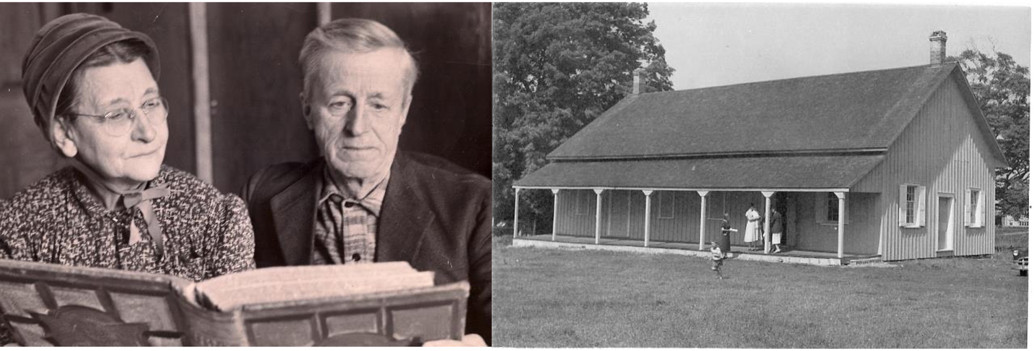 The Starr grandparents reading the Bible, and the Yonge Street Meeting House as it was and is.