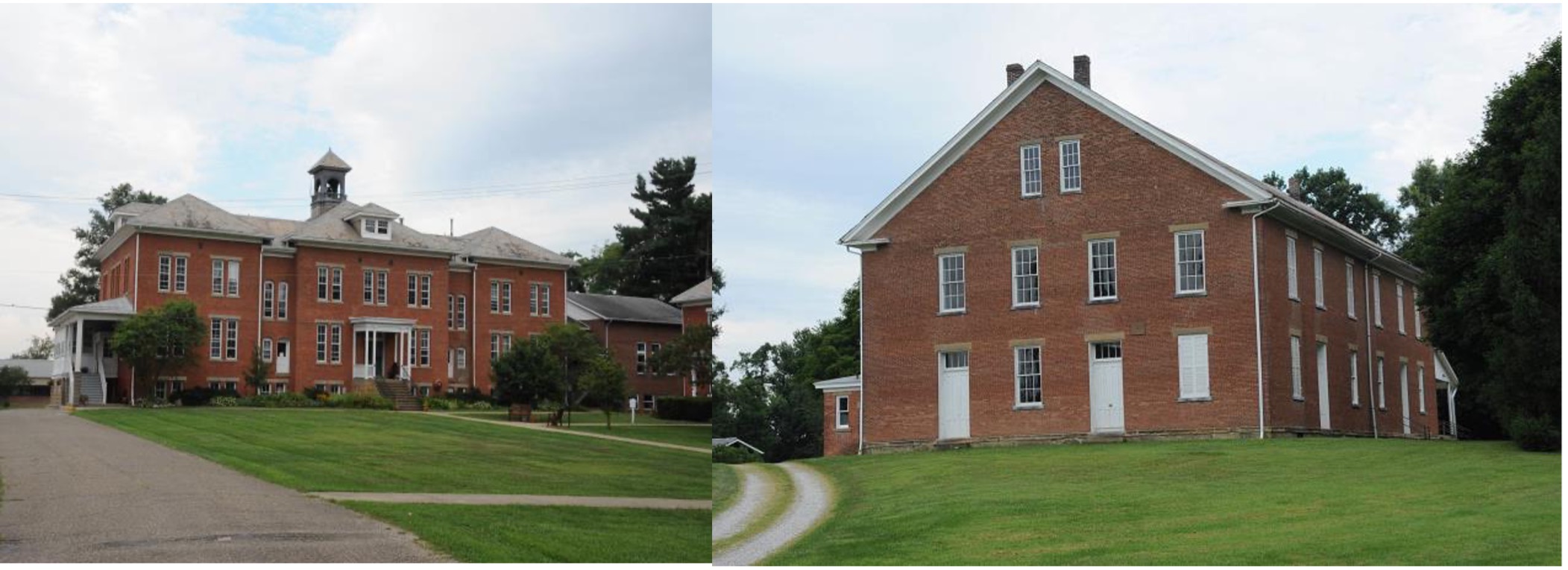 Olney’s Main Building and Stillwater Meeting House as they were then and are today. Photos by J. & R. Klotz.