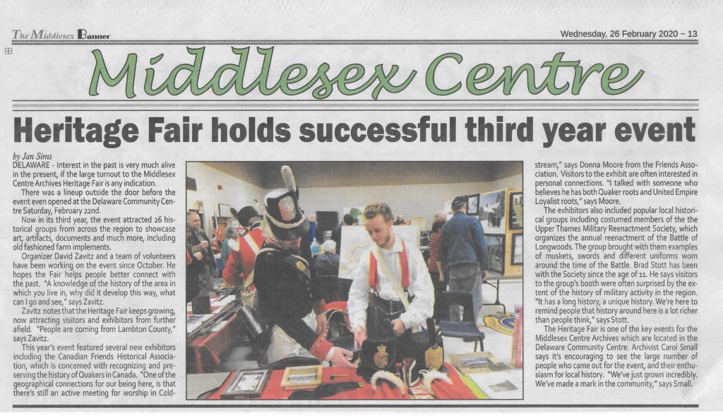 Gord Thompson and I met Dave Zavitz from the Middlesex Centre Archives when we staffed a CFHA booth at the Ontario Genealogical Fair in London in June 2019. Dave, well familiar with CFHA from his own Quaker background, invited us to set up a CFHA display at the Middlesex Centre Archives’ Heritage Fair this last February. This event was in its third year, and it was easy to determine that the event had gained momentum within the historical community. We were very pleased to be invited to attend.