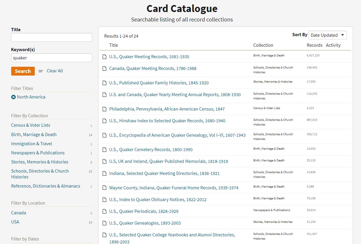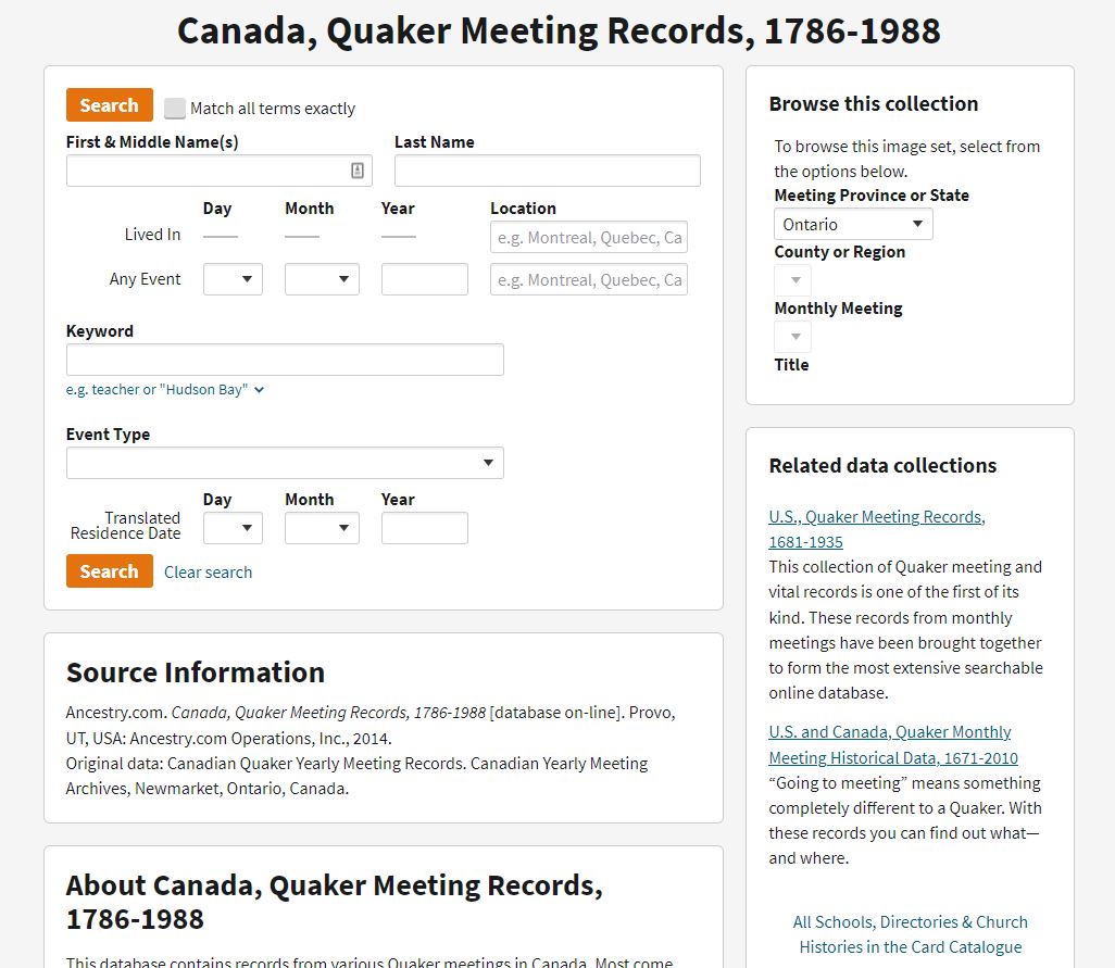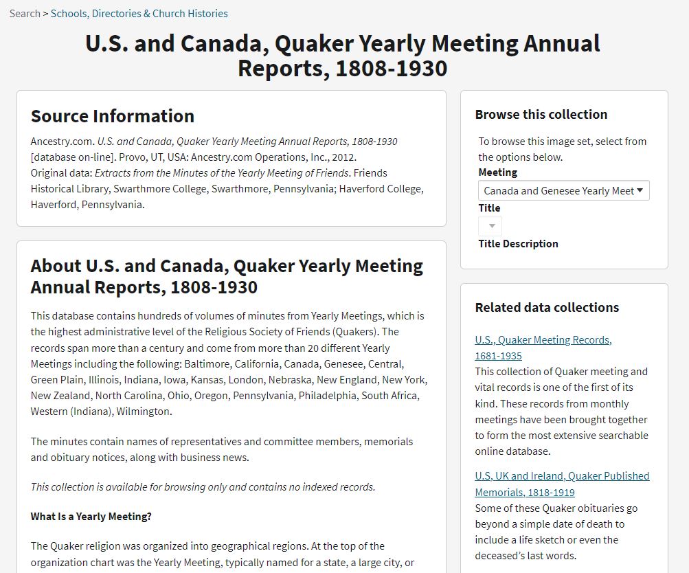 I logged in through my own library (from Hamilton Public Library – thanks!) and was able to find a few resources of note. One is of course the collection of microfilmed books from the Canada Yearly Meeting Archives: