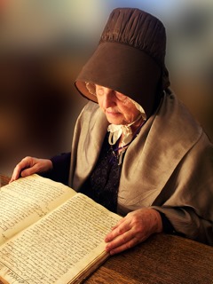 Photo of Jane in historical Quaker costume, wearing Elma Starr’s bonnet