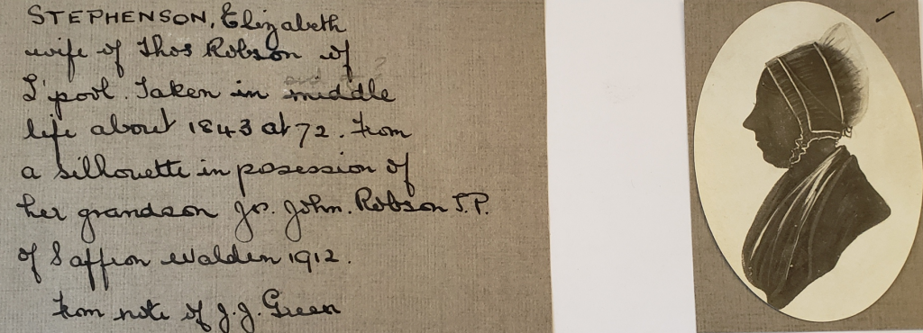 Silhouette of Elizabeth Stephenson Robson [1843] held by Friends House Library, London. Photo by Robynne Rogers Healey.