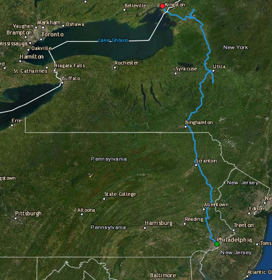 It took three weeks for Robson and Bettle to travel the 528.5 miles (850.5 kilometers) between Philadelphia and Kingston.[4] I have roughly plotted Robson’s route north based on points noted in her diary.