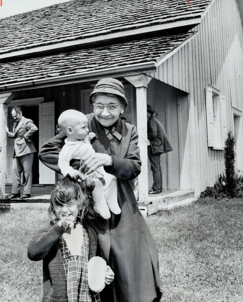 This photo of Elma Starr, taken 29 June 1974 by Keith Beaty for the Toronto Star, shows Elma in front of the Yonge Street meeting house. The photo was taken in anticipation of the 1810 meeting house getting central heating, electric lights, and running water. In the photo, Elma is holding Dylan Horvath in her arms, and Jennifer Horvath is on the left.