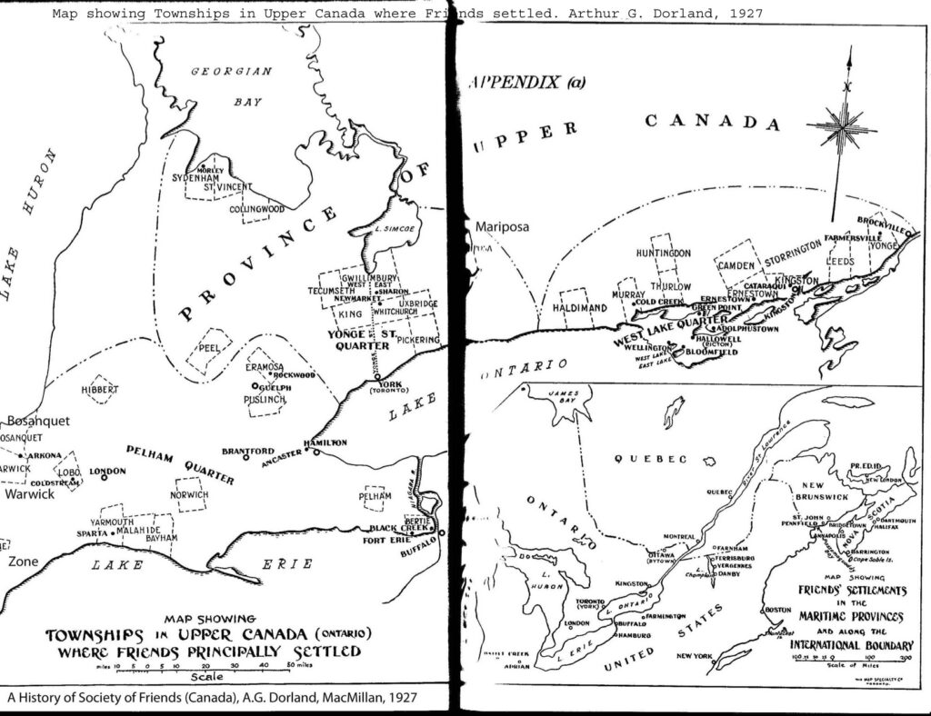 Map showing townships in Upper Canada where Friends settled. Arthur G. Dorland, 1927.