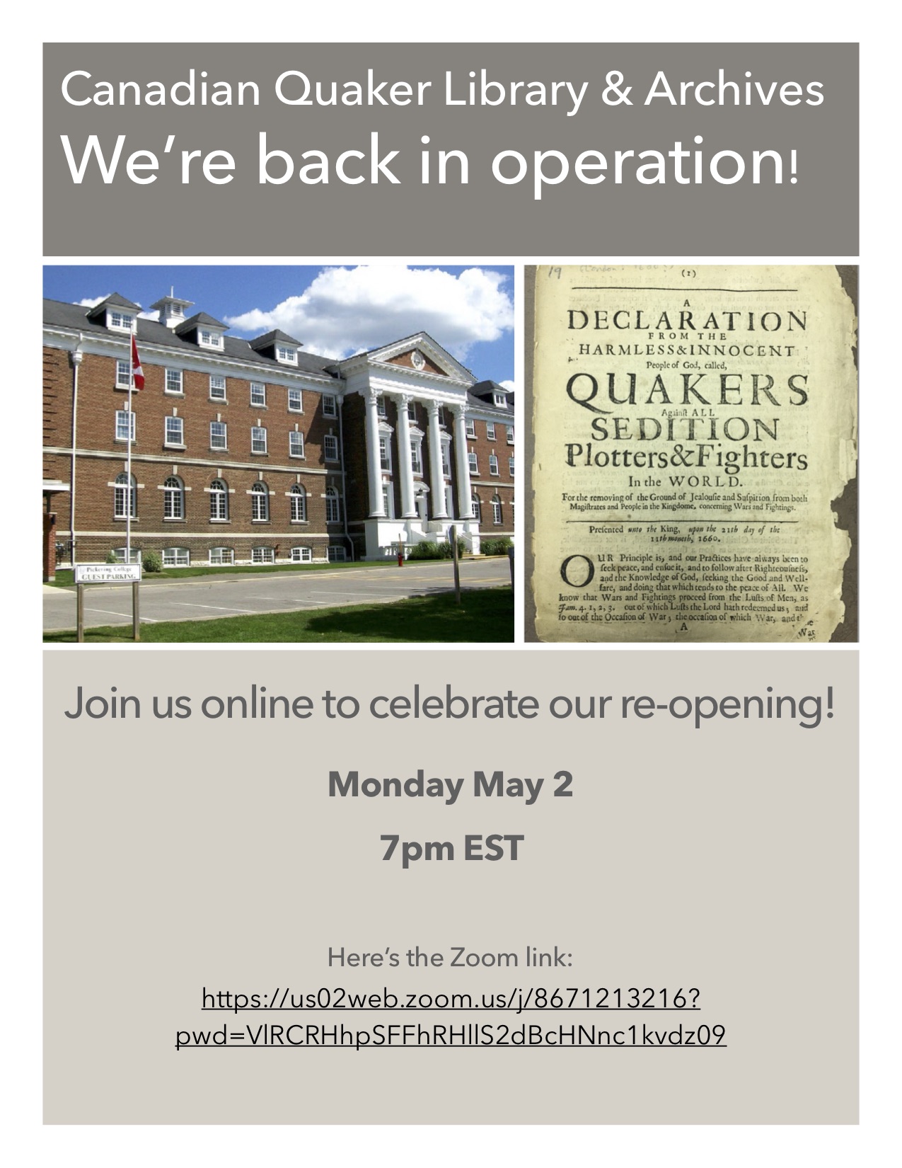 The Canadian Yearly Meeting Archives Committee is delighted to announce the re-opening of the Canadian Quaker Library and Archives on May 2, 2022. CQLA recently announced the appointment of a new archivist and are now ready to welcome guests back to the archives.