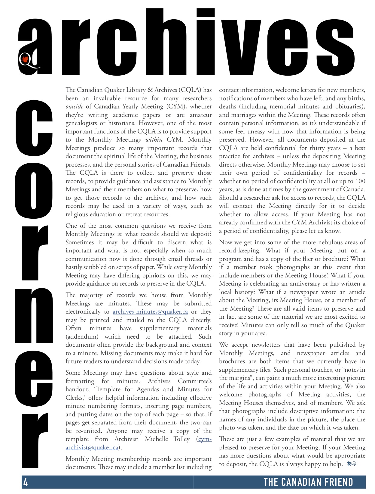 The Canadian Quaker Library and Archives (CQLA) has also been contributing to the Archives Corner, with tips and information for meetings and researchers. You can find the full online version of the Canadian Friend here.